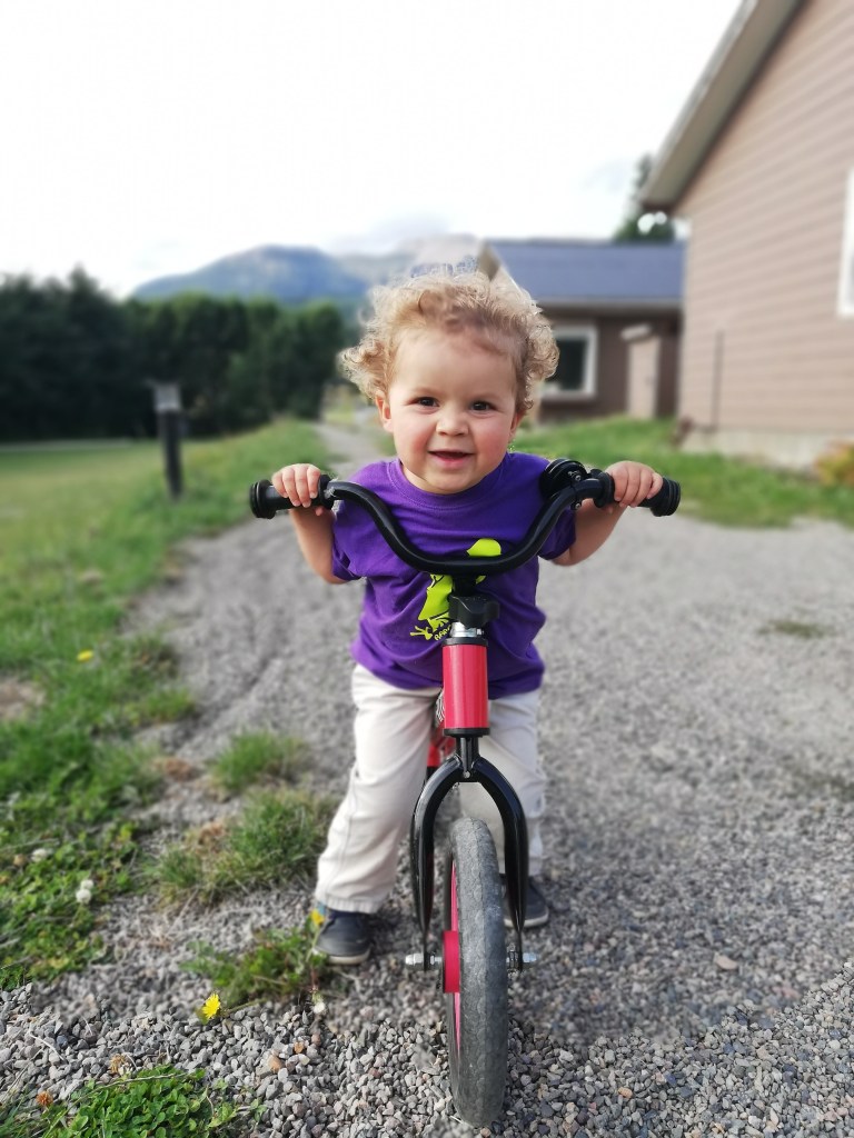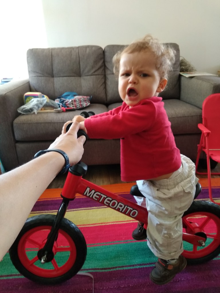 Rapidito la guardamos y, sin que se acordara, se convirtió en su regalo de cumpleaños de 2 años. Ahí recién empezó a sacar a pasear la bici al patio, y fue a los 2 años y medio, en una plaza con una buena superficie de hormigón que entendió la magia de deslizarse. De ahí, Meteorito se convirtió en la extensión de las piernas de Samuel, tímidamente fue conociendo bajaditas pequeñas al principio y rápidamente mas pronunciadas, dejando las zapatillas bien planas en su andar.