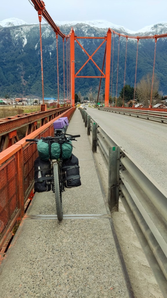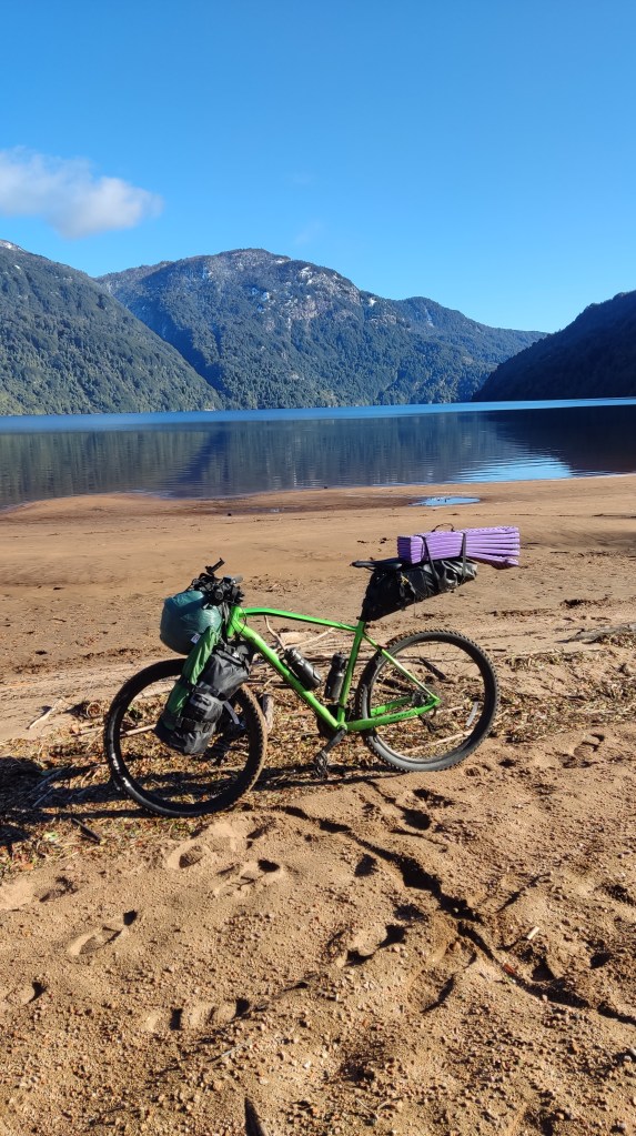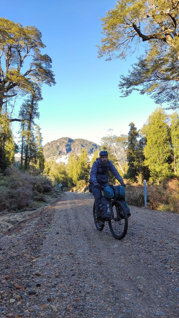 Decidí aventurarme sobre el camino entre Coyhaique y Puerto Aysén por el lago Portales (ruta X-608) y probar un nuevo modo de viaje: el bikepacking. Partimos desde Coyhaique un domingo casi sin vehículos en las calles y en la carretera pasando, en un comienzo, por un pequeño poblado ubicado a 20 km de mi punto de origen, Villa Lago Atravesado. Al salir me sentía eufórico, reviviendo viejos tiempos de una vida nómada que tuve durante dos años viajando en bicicleta. El camino se ve maravilloso sin presencia de hielo, pero al hacer los primeros 15 km, la carretera me da una pequeña lección y me resbale por el hielo, mi primera caída. No fue nada grave pero sí una advertencia de que hay que tener mucho cuidado en el hielo.
