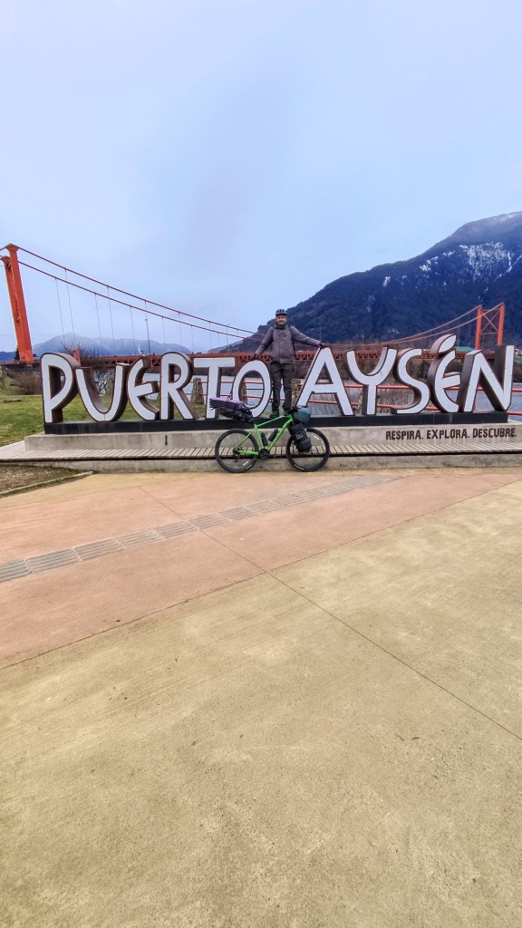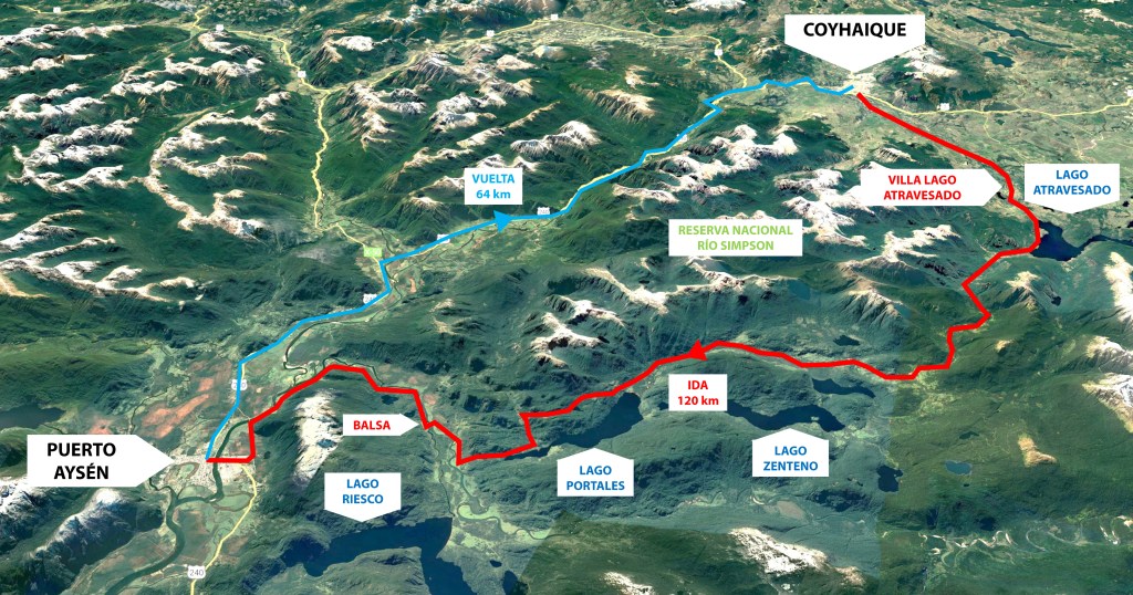 Unos kilómetros después, ya sobre el asfalto, llegué a uno de mis lugares favoritos de esta ruta: los Torreones, un lugar a pie del cerro Sancho y ya con pocas energías tocaba el ultimo tramo para llegar a Coyhaique acompañado por el rio Simpson en todo momento bordeando la carretera. Sin embargo lo más difícil estaba por llegar. A sólo 15 kilómetros de Coyhaique llegamos al túnel farellones y tengo que reconocer que los túneles en bicicleta me ponen un poco nervioso, pero este tenía un toque especial, es en subida y con una curva. Llegado a mitad del túnel me llevé un susto con un camión que frenó bruscamente detrás mío por que veía un auto de frente. A esto, no gracias, por lo cual me llevó a ir por una angosta vereda del túnel. Al salir del túnel ya sabia que estaba en Coyhaique. Sólo tocaba subir un poco más hasta empalmar con la mítica Carretera Austral, la ruta 7. Un poco más allá de ese empalme llegamos al mirador de Coyhaique, lugar que me dio bienvenida y que ponía un punto final a mi viaje.